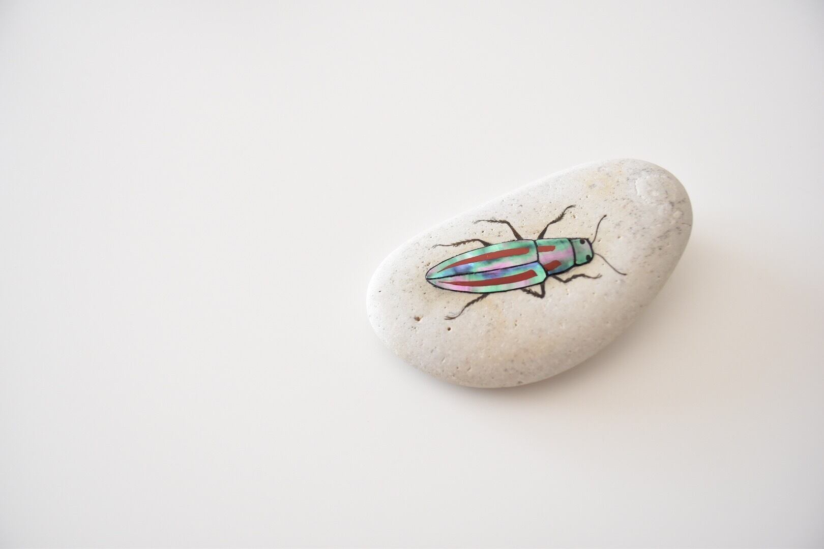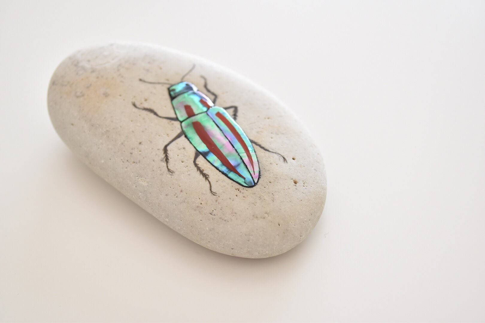 螺鈿(貝殻)の特徴を活かしまさに玉虫色の光り具合を表現しました。