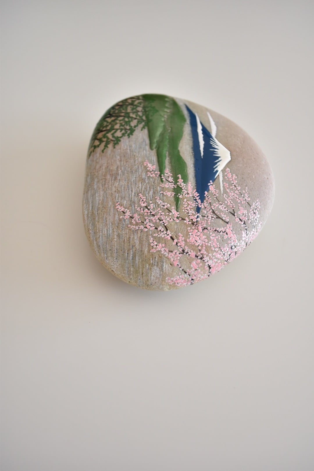 桜の花と富士山の風景を天然の石に漆蒔絵で絵を施しています。
